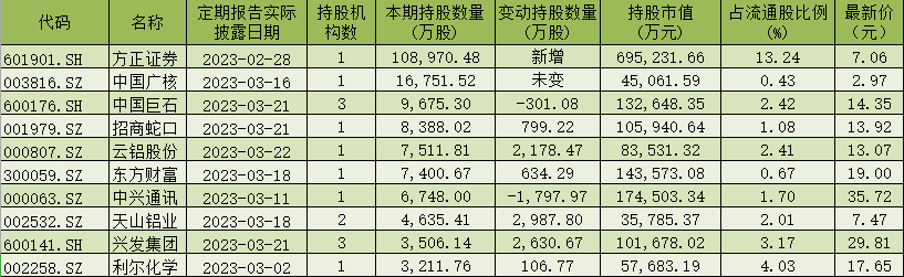 增持個股中,相比2022年三季報,天山鋁業(yè)增持數量最多,社?;鸪止珊嫌嬙黾?987.8萬股,另有興發(fā)集團、云鋁股份、皖維高新等3只個股去年四季度增持超1000萬股,分別為2630.3萬股、2178.5萬股、1198.3萬股;興發(fā)集團增持股市值最高,社?;鹪龀止墒兄岛嫌?.24億元,另有舍得酒業(yè)、云鋁股份、智飛生物、東方財富、天山鋁業(yè)、順絡電子、恩華藥業(yè)等7只個股去年四季度增持股市值超1億元。