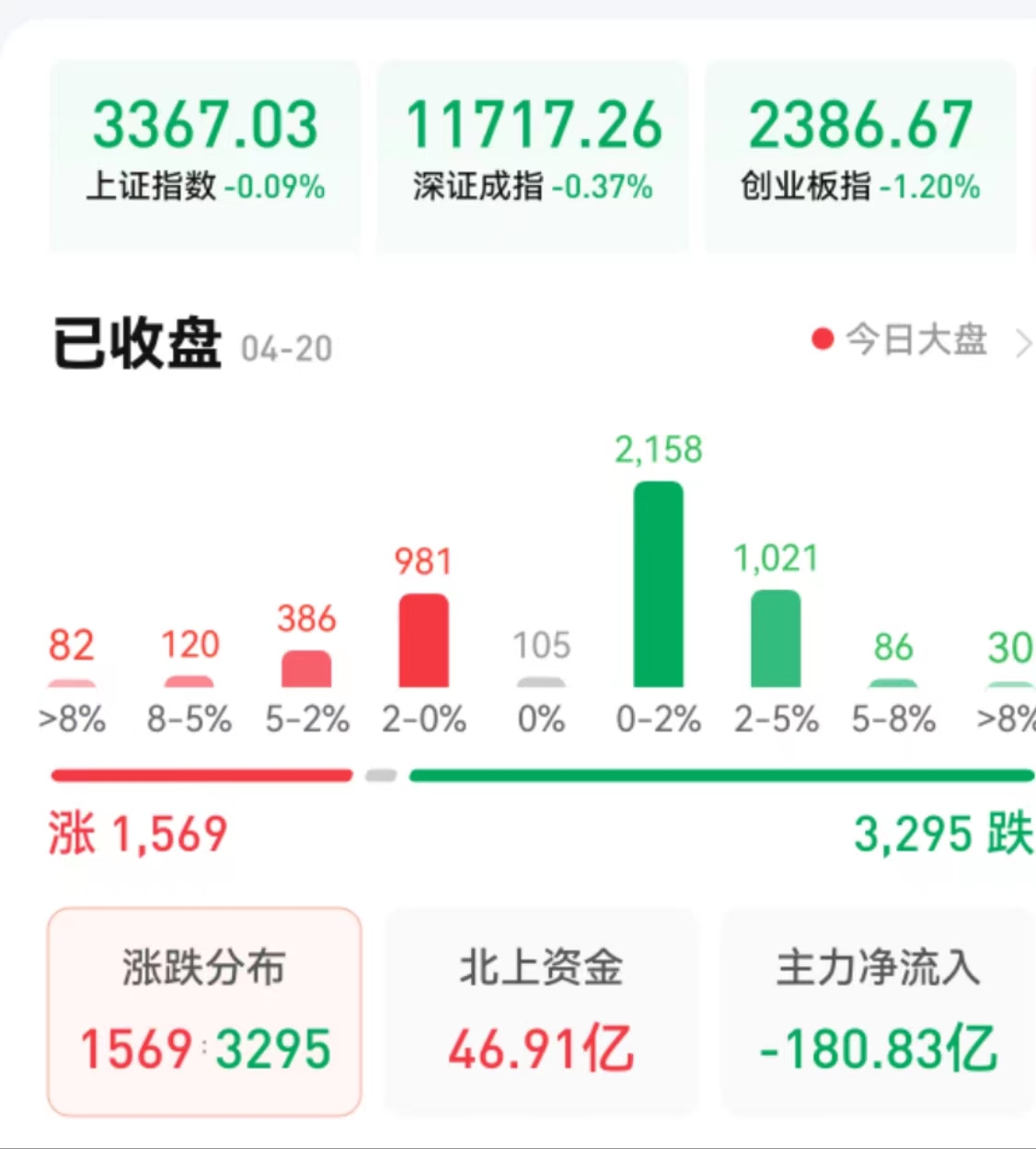周四(4月20日),A股三大股指繼續(xù)震蕩整理。截至收盤(pán),上證指數(shù)跌0.09%報(bào)3367.03點(diǎn),深證成指跌0.37%報(bào)11717.26點(diǎn),創(chuàng)業(yè)板指跌1.20%報(bào)2386.67點(diǎn),滬深兩市合計(jì)成交額11386.85億元,連續(xù)第13個(gè)交易日突破萬(wàn)億元,北向資金凈買入46.91億元??傮w上看,兩市個(gè)股跌多漲少。其中,漲停個(gè)股達(dá)36只,跌停個(gè)股達(dá)25只。