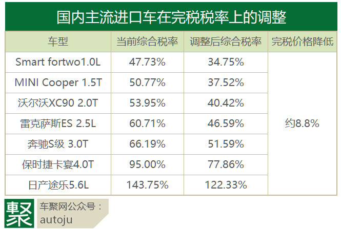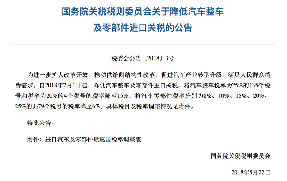 1994年4月1日,我國進(jìn)口汽車市場迎來了第一次關(guān)稅下調(diào)。在175個汽車稅目錄中,有105個進(jìn)行下調(diào)。排量3.0L以上燃油轎車稅率降至150%,3.0L以下車型稅率降至110%,統(tǒng)一下調(diào)70%。今年5月22日國務(wù)院關(guān)稅稅則委員會發(fā)布公告,經(jīng)國務(wù)院批準(zhǔn),自2018年7月1日起,將稅率分別為25%、20%的汽車整車關(guān)稅降至15%,降稅幅度分別為40%、25%;將稅率分別為8%、10%、15%、20%、25%的汽車零部件關(guān)稅降至6%,降低關(guān)稅對于汽車消費(fèi)者來說是一個重大利好消息,理論上無論關(guān)稅降幅如何,都將會使用戶獲得一個低于過往的進(jìn)口汽車終端售價。