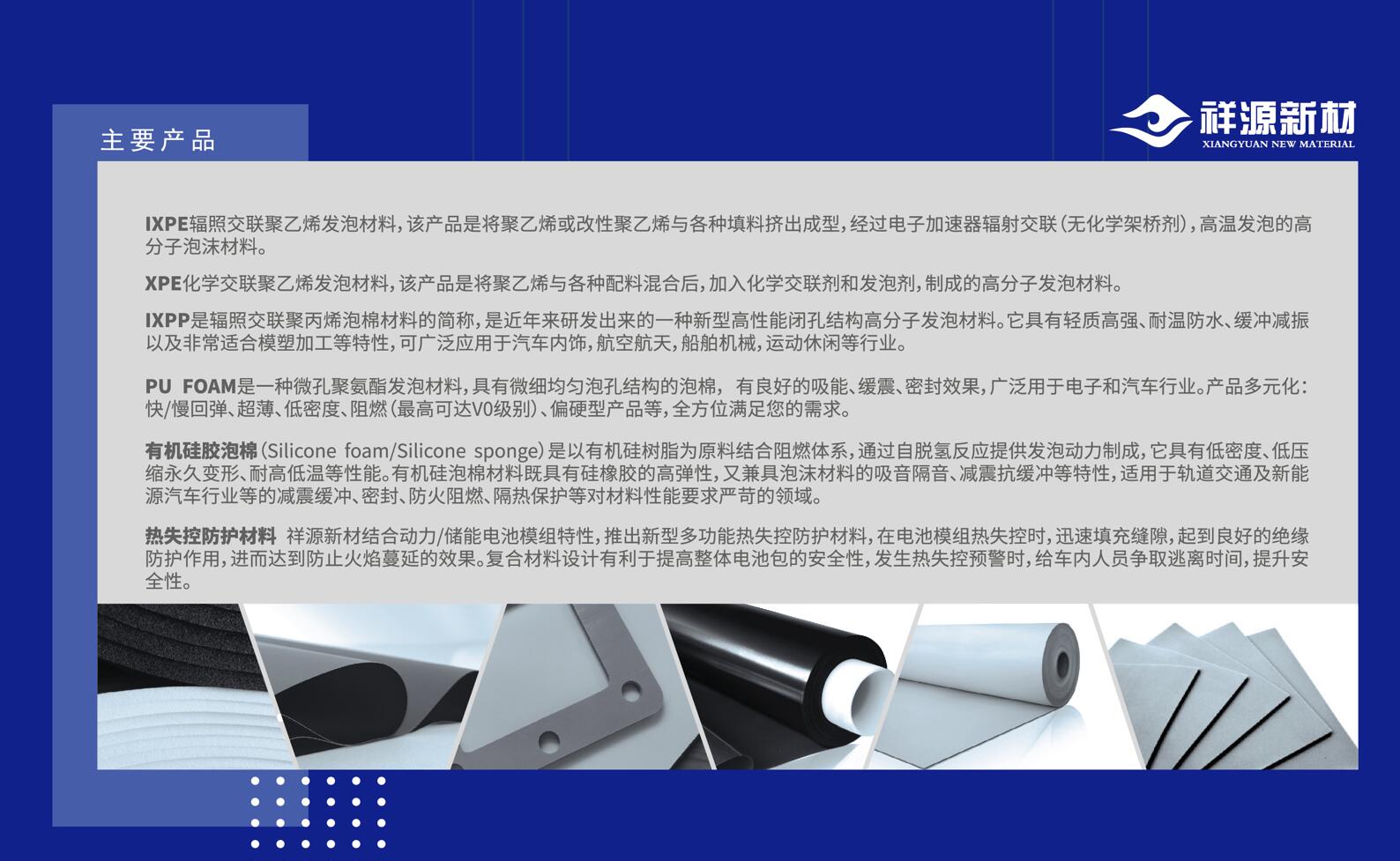 湖北祥源新材科技股份有限公司(股票代碼:300980)始建于2003年,是一家集研發(fā)、生產(chǎn)、銷售聚烯烴發(fā)泡材料、聚氨酯發(fā)泡材料、有機(jī)硅發(fā)泡材料等產(chǎn)品的高新技術(shù)企業(yè)。公司擁有先進(jìn)的生產(chǎn)工藝和生產(chǎn)設(shè)備,經(jīng)過多年發(fā)展,已成為國內(nèi)知名的聚烯烴、聚氨酯發(fā)泡材料供應(yīng)商。