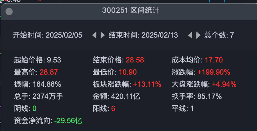 東方財富行情軟件顯示,2月5日至2月13日(午間收盤),7個交易日內(nèi),光線傳媒漲幅達199.9%,其中2月10日、2月11日、2月12日3個交易日光線傳媒均以20CM漲停收盤。目前,光線傳媒已成為A股市值最高的影視院線上市公司。