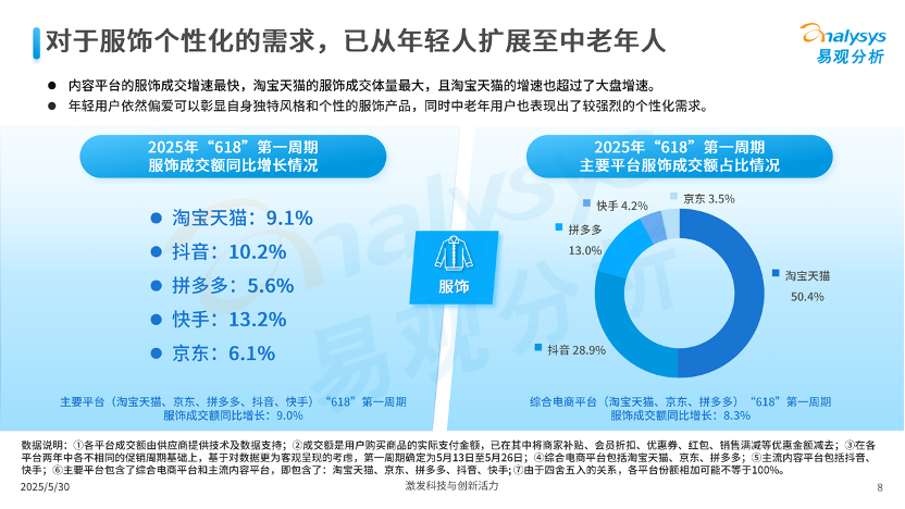 易觀分析數(shù)據(jù)顯示,“618”第一階段的銷(xiāo)售中,淘寶天貓服飾成交額在全平臺(tái)的占比達(dá)50.4%,抖音占據(jù)28.9%,京東占據(jù)3.5%,淘寶天貓的體量最大,優(yōu)勢(shì)明顯。