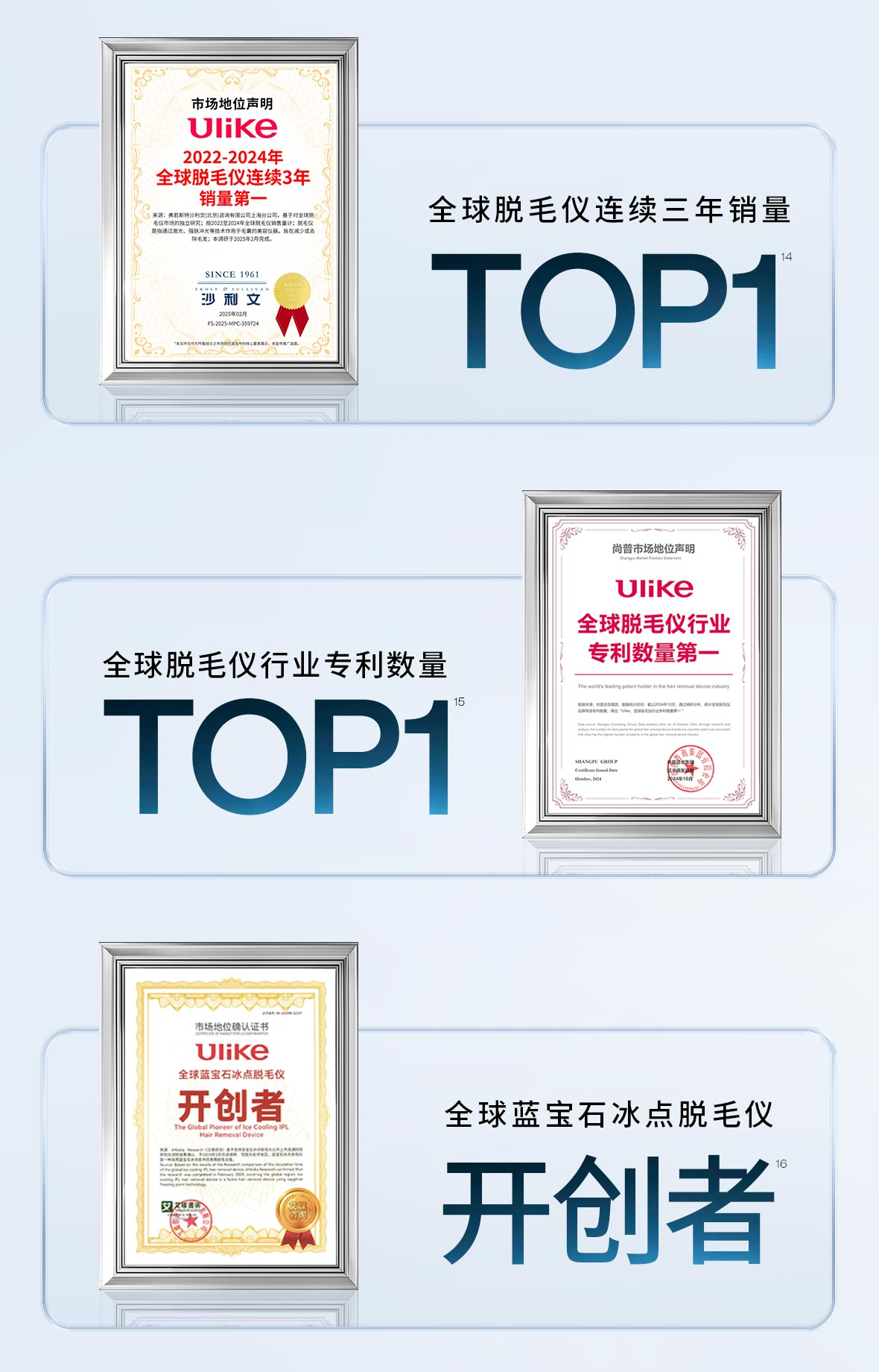 Ulike不僅在中國(guó)連續(xù)10年618銷售行業(yè)領(lǐng)先,更是被認(rèn)證為“全球銷售第一的脫毛儀”。根據(jù)弗若斯特沙利文(Frost&Sullivan)調(diào)研數(shù)據(jù),在2016年-2024年度中國(guó)脫毛儀市場(chǎng)中,Ulike連續(xù)9年銷售Top1;在2022年-2024年度全球脫毛儀市場(chǎng)中,Ulike連續(xù)3年銷量Top1。