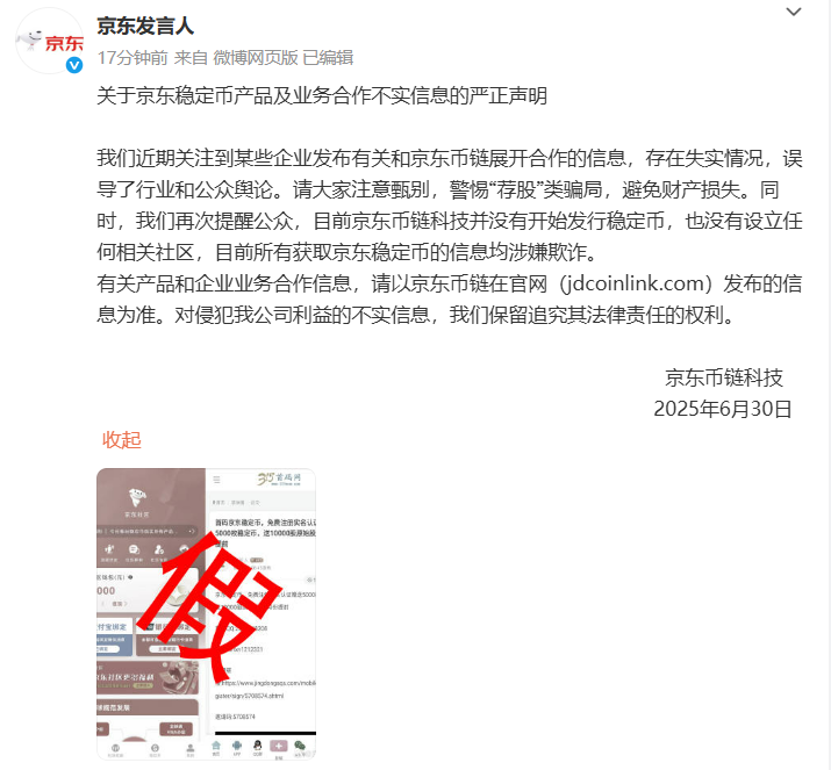 對此,“京東發(fā)言人”官方微博6月30日發(fā)文表示:“我們近期關注到某些企業(yè)發(fā)布有關和京東幣鏈展開合作的信息,存在失實情況,誤導了行業(yè)和公眾輿論。目前京東幣鏈科技并沒有開始發(fā)行穩(wěn)定幣,也沒有設立任何相關社區(qū),目前所有獲取京東穩(wěn)定幣的信息均涉嫌欺詐。”