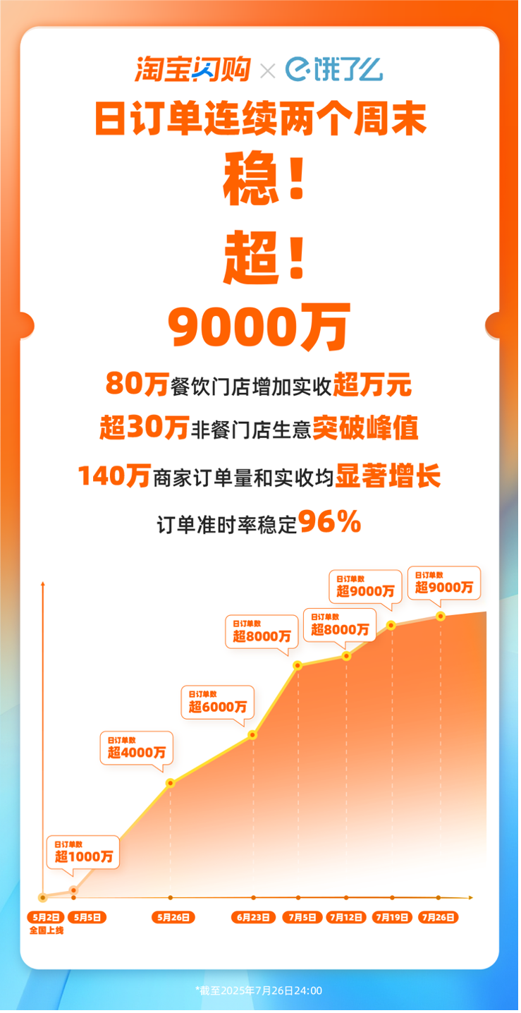 淘寶閃購(gòu)自5月份上線以來,日訂單屢創(chuàng)新高,從1000萬(wàn)單、4000萬(wàn)單、6000萬(wàn)單到連續(xù)兩周峰值超8000萬(wàn)單,再到連續(xù)兩個(gè)周末的日訂單超9000萬(wàn)單。社會(huì)消費(fèi)熱情被持續(xù)點(diǎn)燃,商家生意持續(xù)增長(zhǎng)、收入顯著提升,新興服務(wù)業(yè)市場(chǎng)蓬勃發(fā)展、已進(jìn)入多平臺(tái)良性競(jìng)爭(zhēng)的新階段。