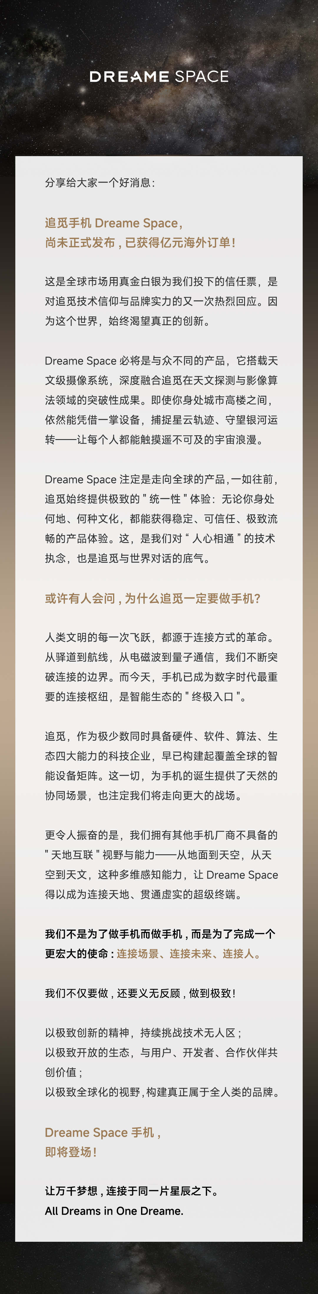 Dreame Space定位高端旗艦,在保障高端綜合體驗(yàn)的同時(shí)還帶來(lái)了“天文攝影”這一區(qū)別同類(lèi)產(chǎn)品的核心賣(mài)點(diǎn),踐行追覓的創(chuàng)新理念,以此試圖重新定義智能旗艦手機(jī)的標(biāo)準(zhǔn)。