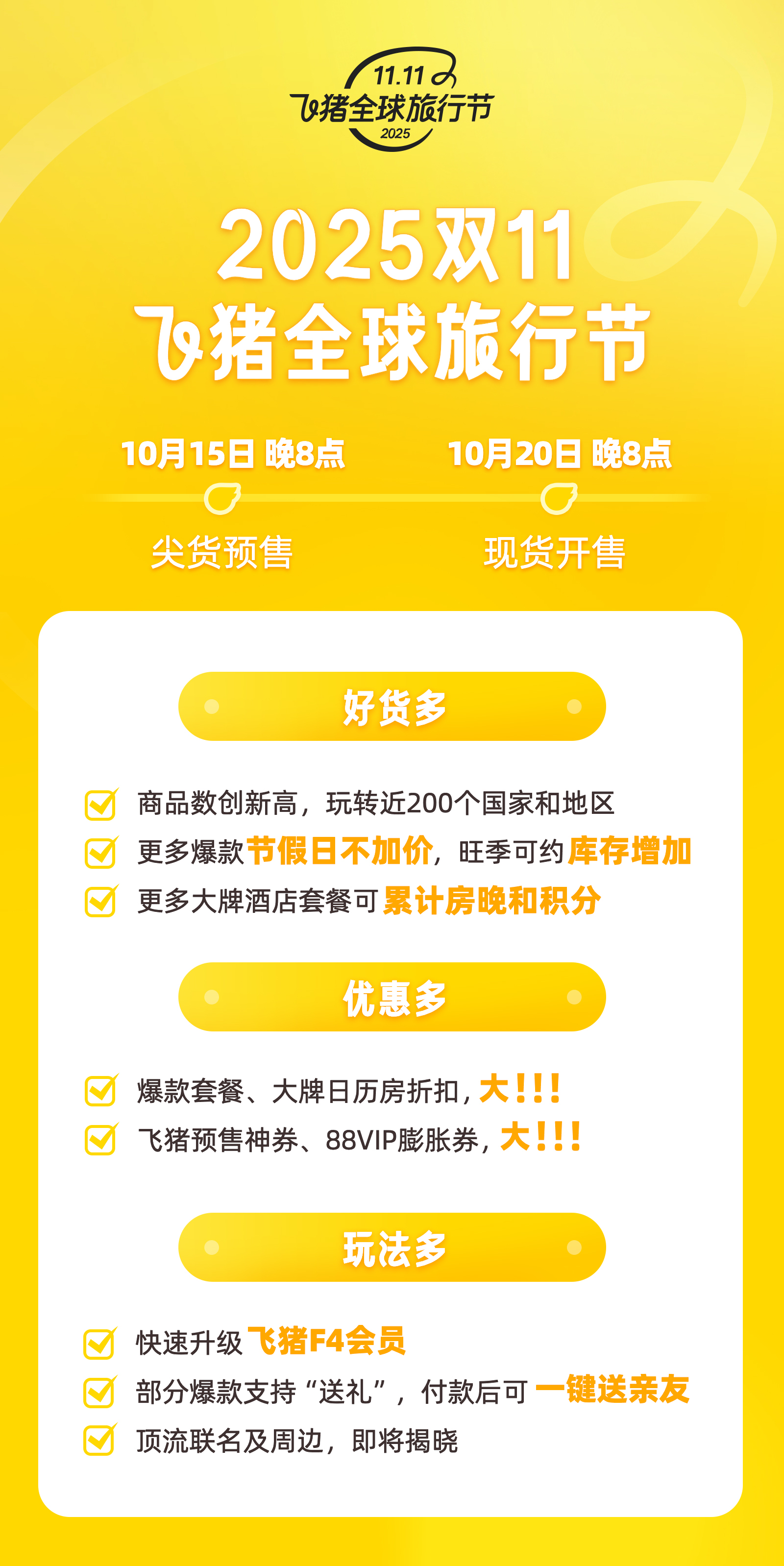 10月15日,飛豬宣布2025年“雙11”全球旅行節(jié)啟動(dòng),其中尖貨預(yù)售于當(dāng)日晚8點(diǎn)開始,全量現(xiàn)貨將于20日晚8點(diǎn)開始。