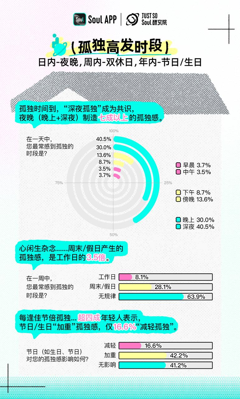 在較長的一周周期之中,周末/假日產(chǎn)生的孤獨時刻是工作日的3.5倍之多;而在年內(nèi),42.2%的年輕人表示節(jié)日/生日會“加重”自己的孤獨感,前者是喜氣洋洋的樂景襯托出“作者”的哀情,后者是越長大越孤單,越長大越不安.....。