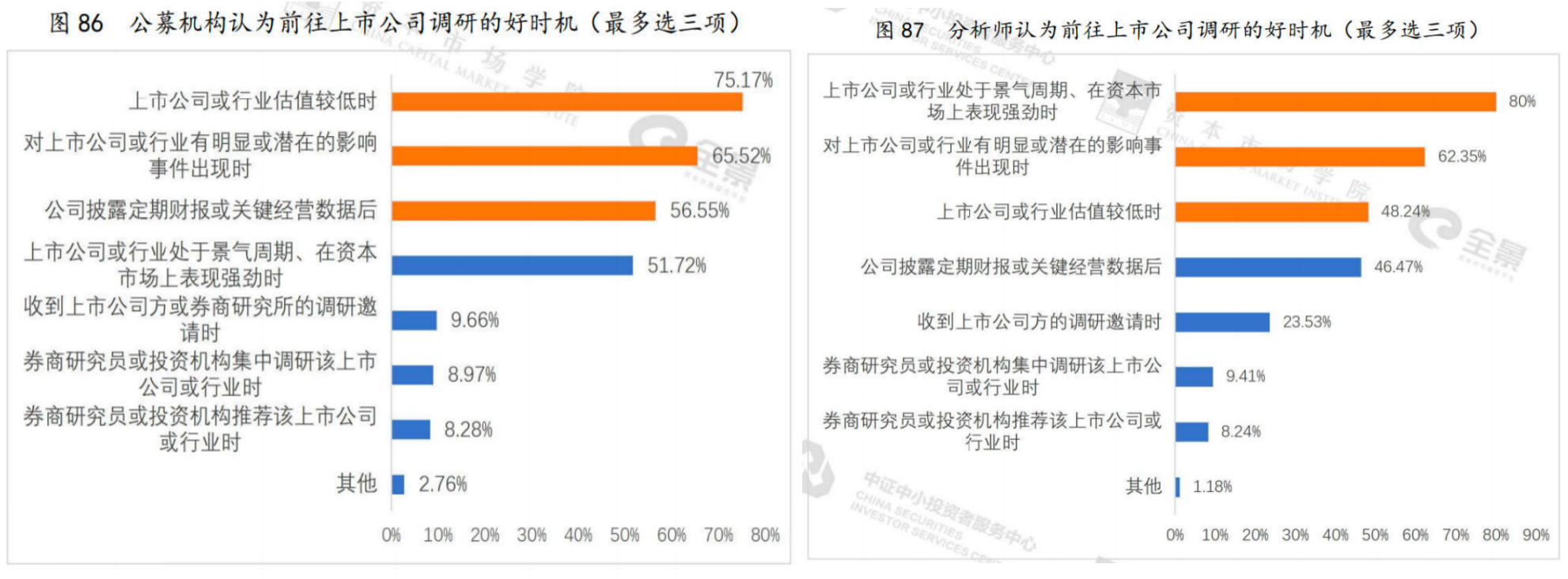 一是善用機(jī)構(gòu)投資者和分析師調(diào)研時(shí)點(diǎn)的偏好,獲得更多關(guān)注。分析師偏好在上市公司或行業(yè)“景氣時(shí)”去調(diào)研,公募機(jī)構(gòu)偏好在上市公司或行業(yè)“低谷時(shí)”去調(diào)研,而且兩方都偏好在“上市公司或行業(yè)有重大影響事件時(shí)”去調(diào)研。
