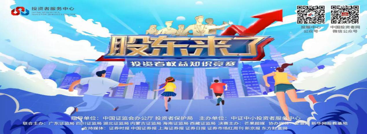 《股東來了》2021投資者權(quán)益知識競賽活動,是由中國證監(jiān)會辦公廳、投資者保護局指導,中證中小投資者服務(wù)中心聯(lián)合廣東、四川、湖北、內(nèi)蒙古、海南、西藏六證監(jiān)局共同舉辦。本次活動面向社會公眾,以投資者喜聞樂見的競賽形式普及權(quán)益保護知識,倡導投資者“長期投資、價值投資、理性投資”,引導投資者“全面知權(quán)、積極行權(quán)、依法維權(quán)”。具體活動流程、游戲規(guī)則請關(guān)注“投服中心”公眾號、“中國投資者網(wǎng)”公眾號、中國投資者網(wǎng)進行查閱。